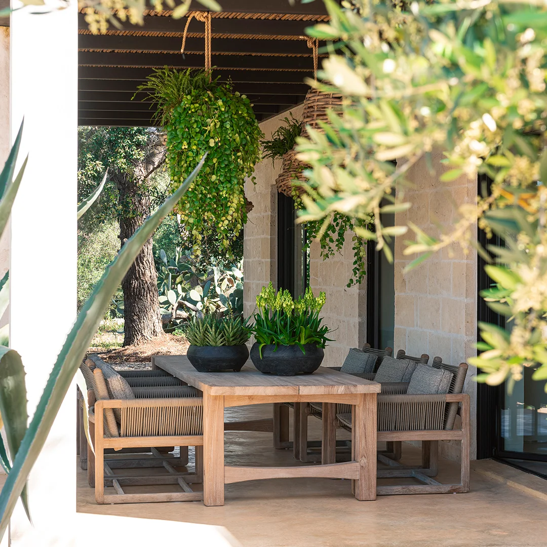 Το τραπέζι φαγητού Jacoba Low ενσαρκώνει τη δεξιοτεχνία του μασίφ ξύλου τικ και την ανεπιτήδευτη κομψότητα. Ένα φιλόξενο κεντρικό κομμάτι, σχεδιασμένο για να φέρνει τους ανθρώπους κοντά και να αναδεικνύει τη φυσική ροή κάθε εξωτερικού χώρου.