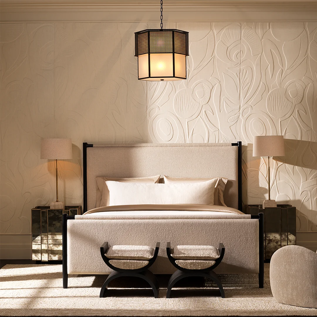 Designed for both elegance and versatility, the bed features sumptuous Renato ecru recycled fabric upholstery and a slatted base while accommodating a box spring for enhanced comfort. Every Eichholtz detail reflects meticulous craftsmanship, creating a centerpiece that elevates the bedroom into a serene, sophisticated sanctuary.