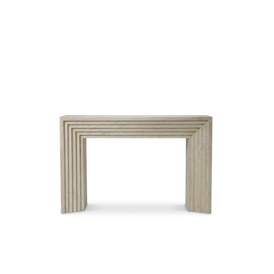 Embodying serene luxury, the Console Table Tarrington showcases a sleek travertine surface with natural veining that whispers elegance.
